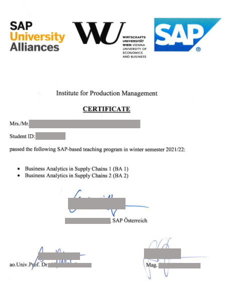 The "Productionmanagement" department of the University of Economics and Business in Vienna led by professor Taudes has been "notarizing" certificates for SAP training courses for some time. Using a webapplication for hundreds of certificates can be a very cumbersome task.In order to reduce this workload the Universites management decided to use infinite trust digital's "certification/notarization" client for all SAP trainings.